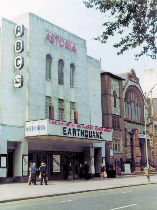 Left: In 1975 the Astoria installed Sensurround to screen Earthquake; Right: The Astoria derelict 17 years after its closure, with artistic additions by Banksie and others.