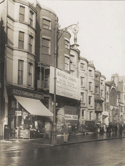 Unusually, a photographic record survives of the Astoria under construction in 1933. (Cameras usually arrive at the demolition stage.) The hoarding on the house-fronts [left] is a trailer for the cinema to come.