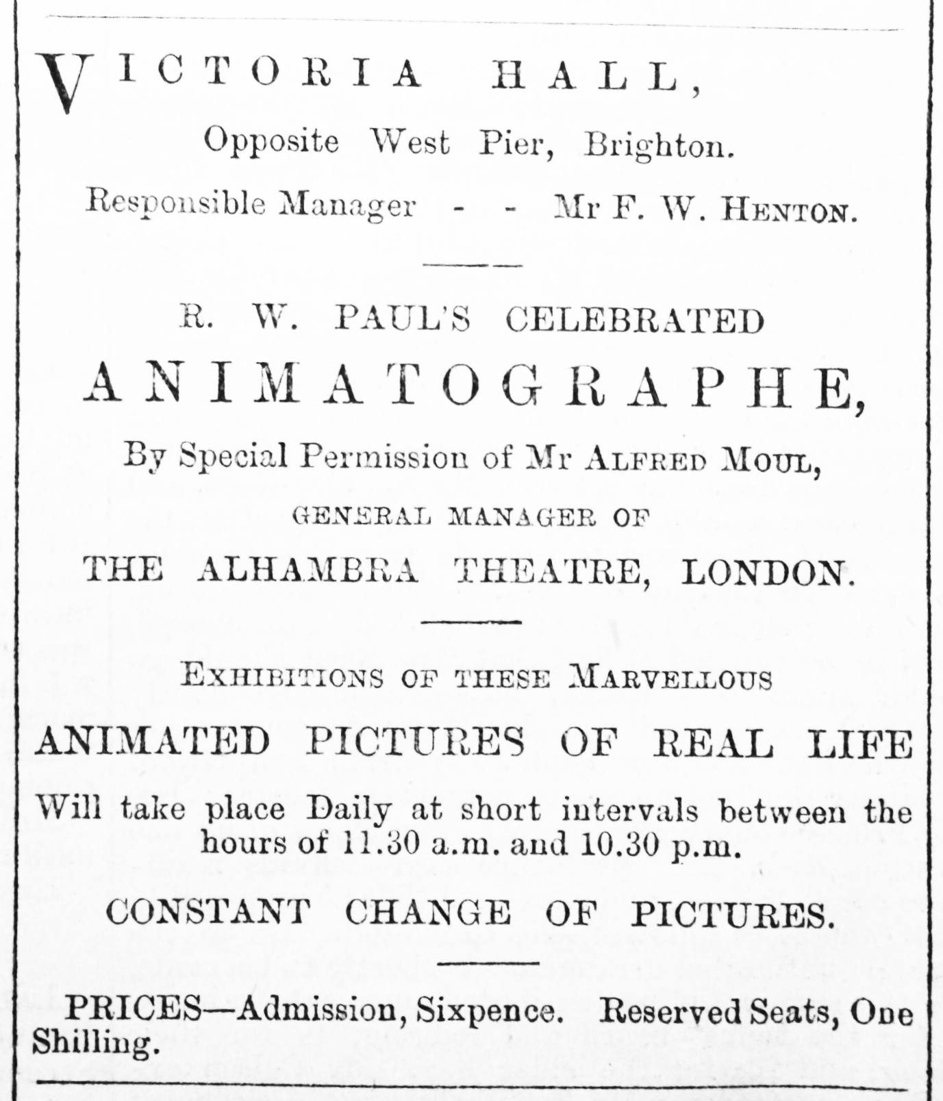 1896 July 6 R W Paul's 'Celebrated Animatographe' begins a run of shows that lasts until November. Admission 6d, reserved seats 1s.