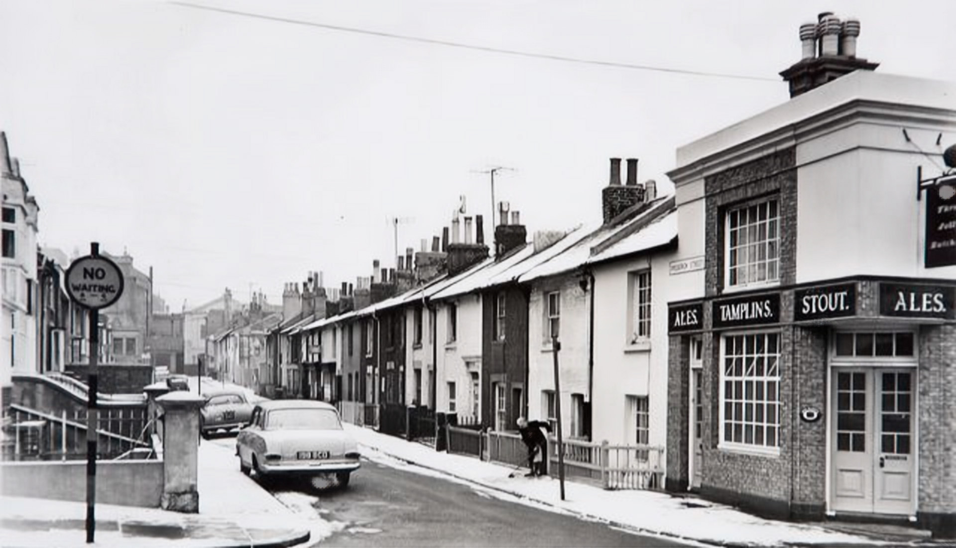 The street led to Wick Farm. One cottage 'and ten other houses unfinished' listed in Fo1852. Several mews are to the rear of the west side at 12 (Farm), 16 (Goldsmid), 18, 19-20 and 22. ph 3, Lansdowne Arms opened in 1856, associated with livery stables in Lansdowne Mews. The name was changed to Coopers Cask early this century. PArt of the Stonegate chain it was closed in 2025. —Here is Lansdowne Mews. —Here is Farm Mews. ph 13, Farm Tavern opened in 1856 and has kept its name ever since. |