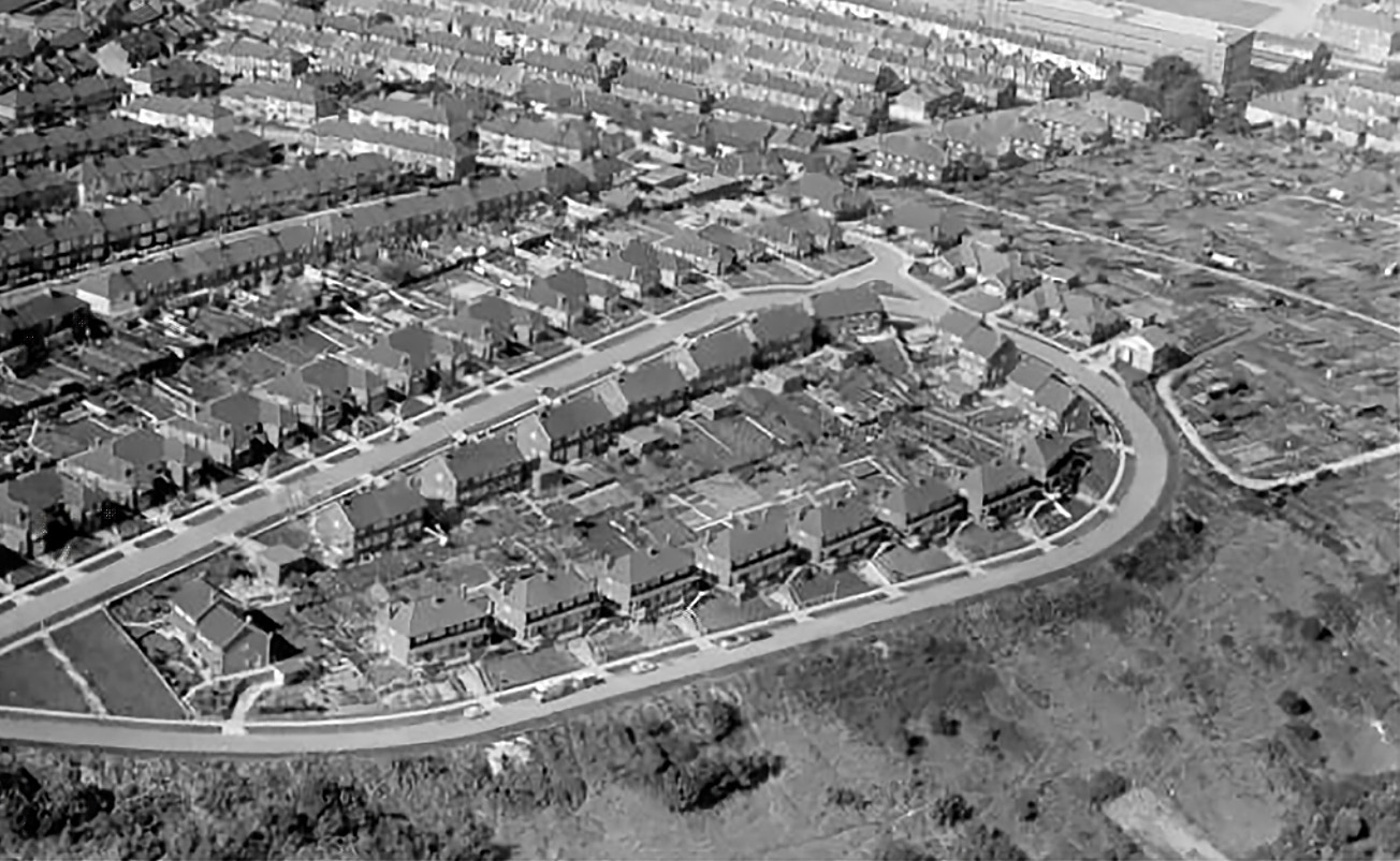 Lower Bevendean | Housing estate, built in the early 1930s and late 1940s, the latter peiod including the Plymouth Avenue self-build project.![]() Lower Bevendean from the north-east, with Jevington Drive in the forground. |