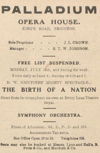 1912 April 6 Opened by Alderman Edward Geere as a cinema, briefly called Grand Cinema De Luxe, owned by Grand Cinema De Luxe (Palladium (Brighton) Ltd); 1,200 seats in an elaborate setting. Prices 3d, 6d, 1s and 2s 6d.