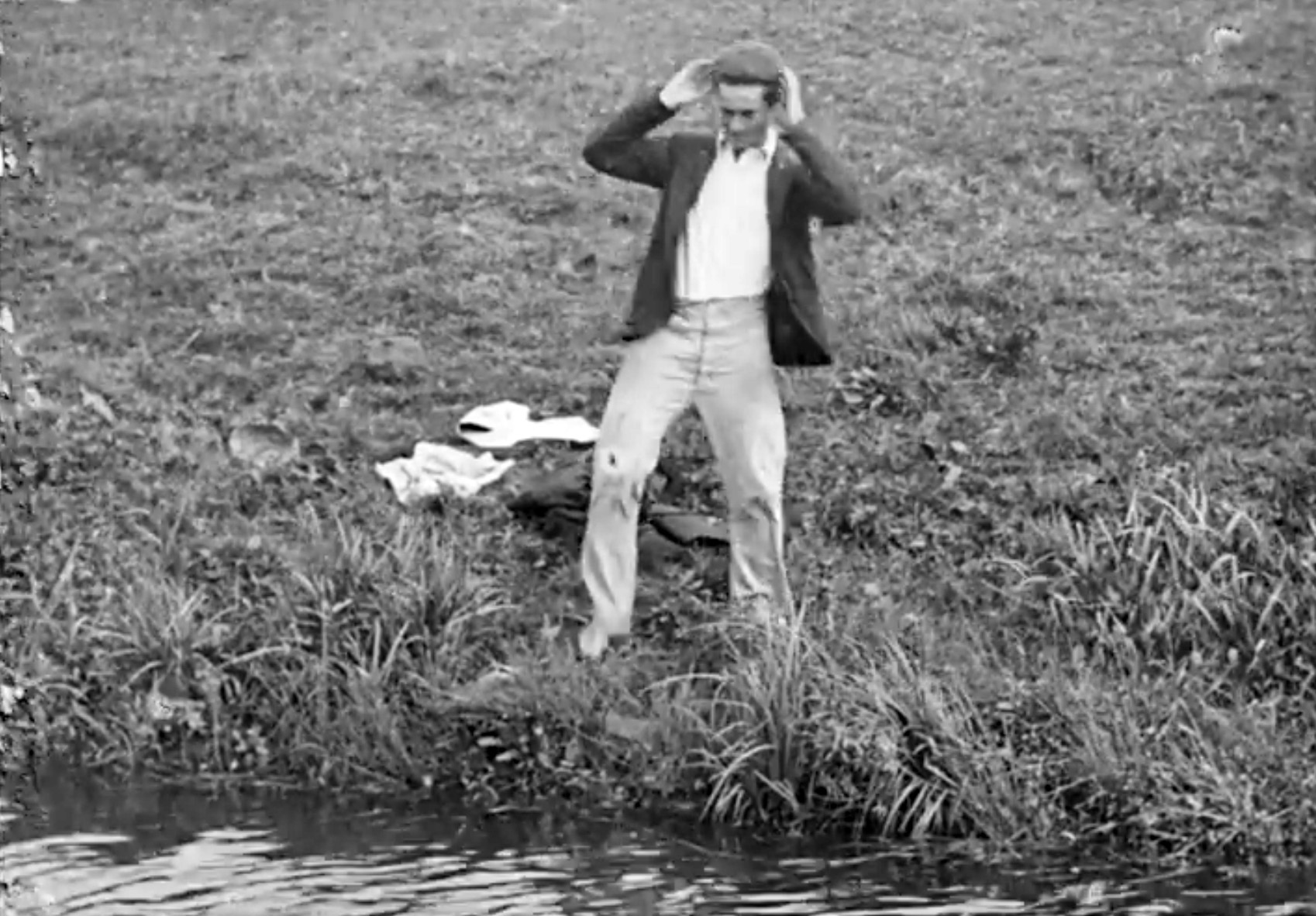 —‘A man on a river bank removes his jacket and cap, intending to take a swim, but as each item of clothing is removed it is immediately replaced by another. Exasperated, he dives in fully clothed, and pops out again wearing his bathing suit. However, the clothes he has left in the water follow him out one by one and he finds himself fully dressed again. He walks away resignedly, followed by the clothing he has left on the bank.’(National Film Archive catalogue description.) (October, 80ft.) Released in the US by Kleine and Biograph, 28 November 1903.